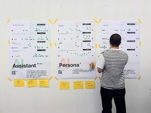 Die Teilnehmer:innen konnten alle drei KI-Typen selbst testen. Dazu gab es jeweils eine kurze Einführung, die die spezifische Rolle der KI-Typen erklärte und den Teilnehmer:innen ihre Aufgabe. Anschließend wurde gevotet – ganz anlog, mit Klebepunkten. Vier Dimensionen galt es jeweils zu bewerten und anschließend zu diskutieren.